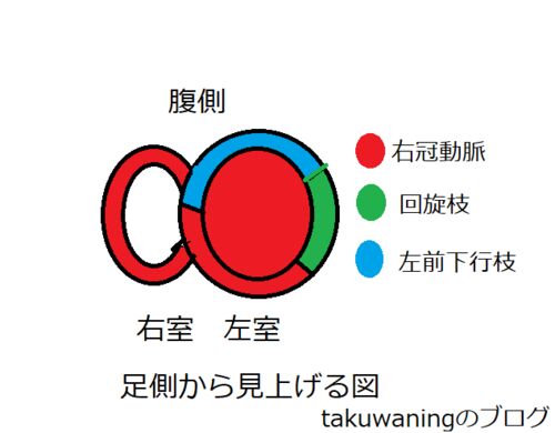 冠動脈の支配領域をまとめましょう。 (ちなみに冠動脈の走行については takuwaning.hatenadiary.com 上の記事でまとめています。 冠動脈による心筋の栄養支配領域は以下の図のようになります。 右冠動脈の支配する領域は 右室全体、心室中隔の背側半分、左…